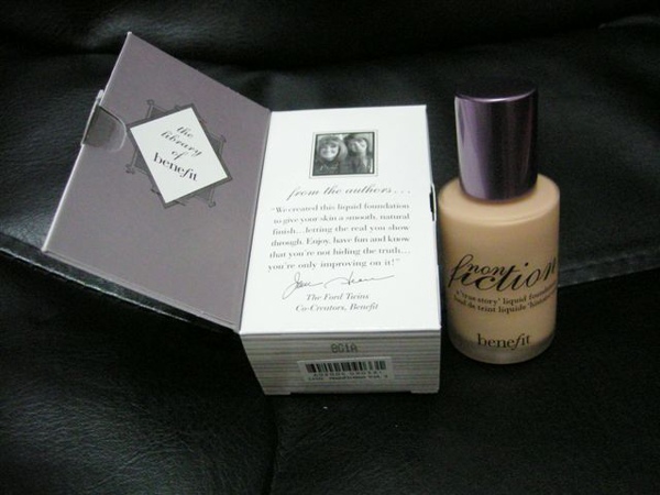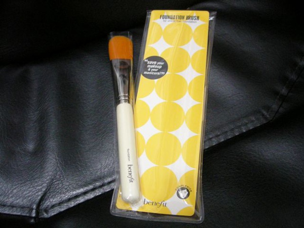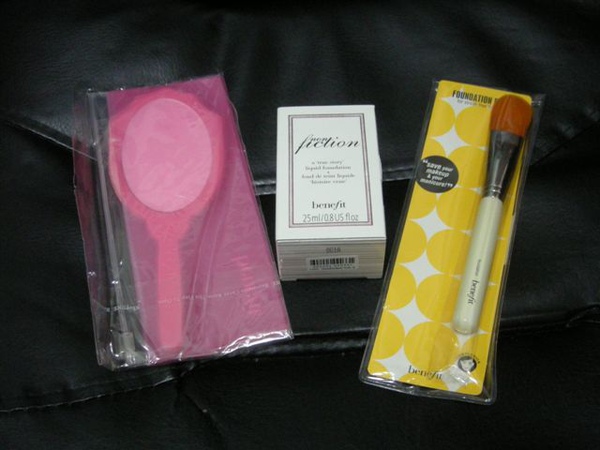 左邊是benefit收納袋、中間是粉底液、右邊是粉底刷