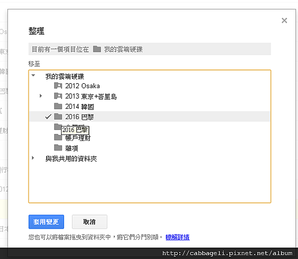 假設我們要將紅色標示的 test1 文件檔案分類至 2016 巴黎 的資料夾下