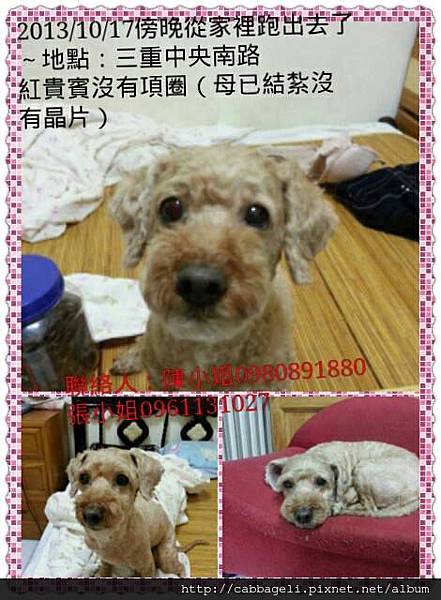 朋友家的狗走失了是紅貴賓 年齡約7歲有剃毛 走失時身上沒有戴任何項圈 長尾巴 未斷尾 胸口有白毛是母狗已結紮 沒有晶片如果有看到類似的可以在下面留言或是直接連絡 陳小姐 0980891880張小姐 0961131027謝謝大家的幫忙>"<