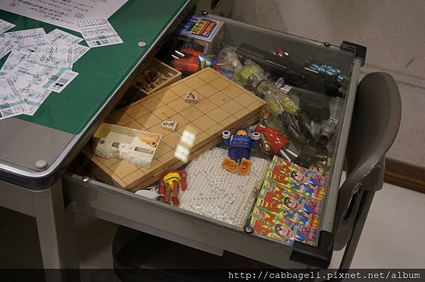 靠近一看,勘吉的抽屜裡面都是公仔和遊戲