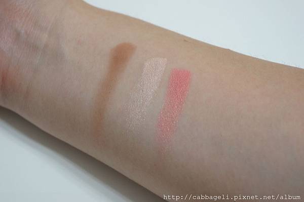 打亮色和腮紅色有非常多的珠光 修容色是純霧面的