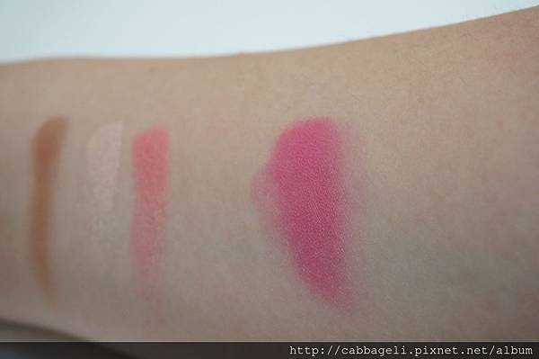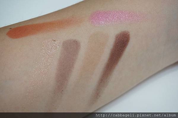 上面兩色是腮紅 橘色霧面粉很細 很顯色 右邊有珠光的粉色也很顯色